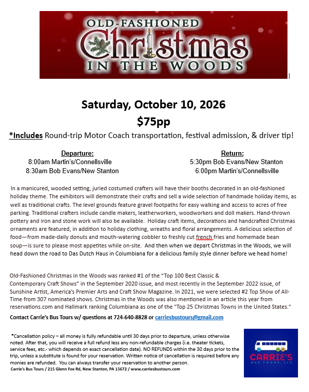 Back to All Events Old-Fashioned Christmas in the Woods Saturday, October 10, 2026 8:00 AM 6:00 PM Google Calendar ICS Printable Flyer